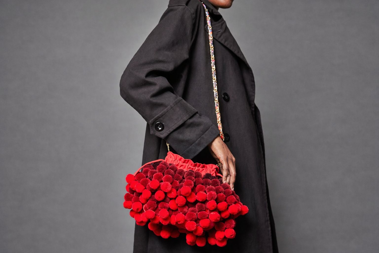 Handcrafted with ombré pom poms, this sculptural bag features a removable chain-link shoulder strap for versatile wear. Designed to ground bold texture with clean hardware, it transitions seamlessly from casual to elevated settings.