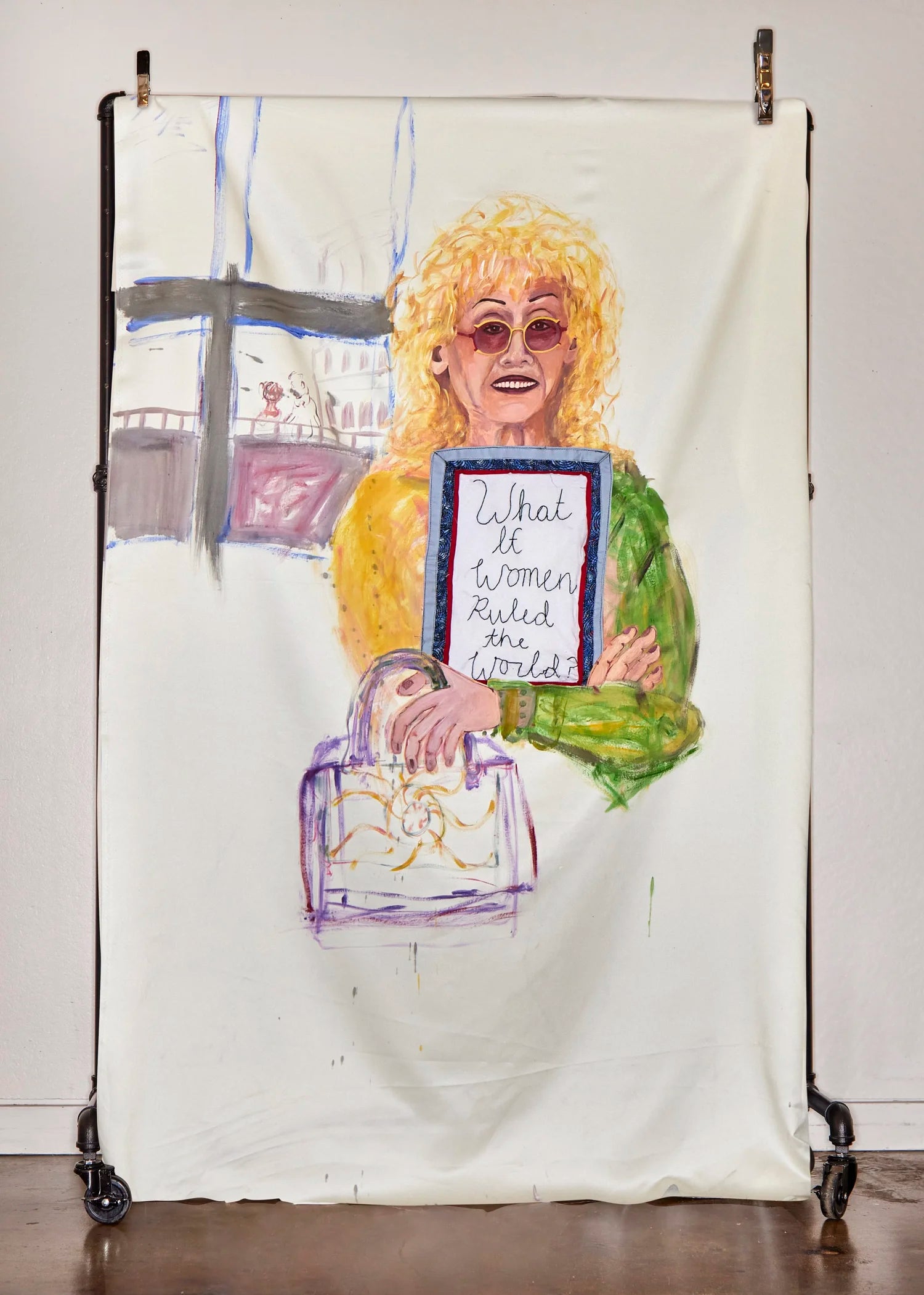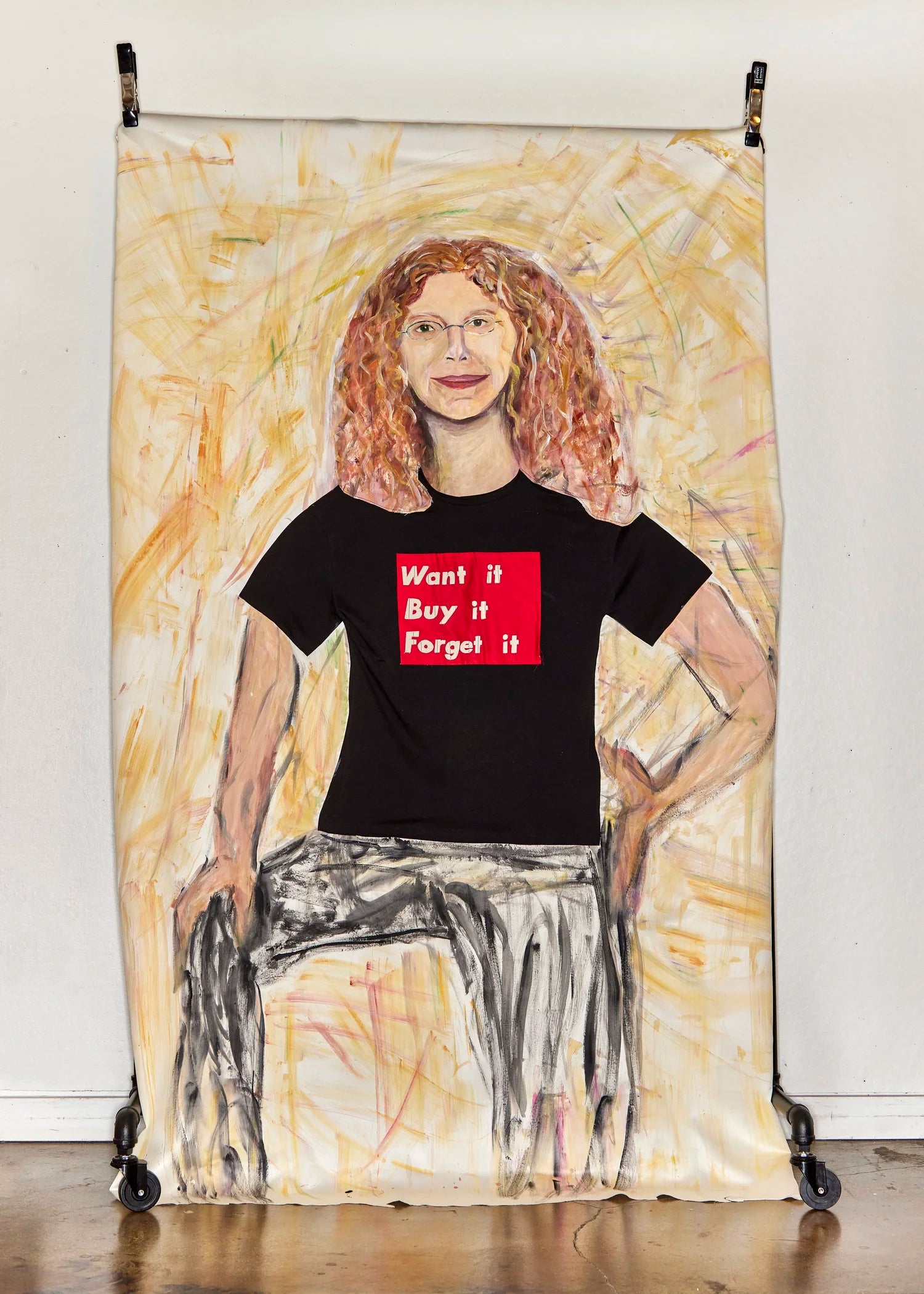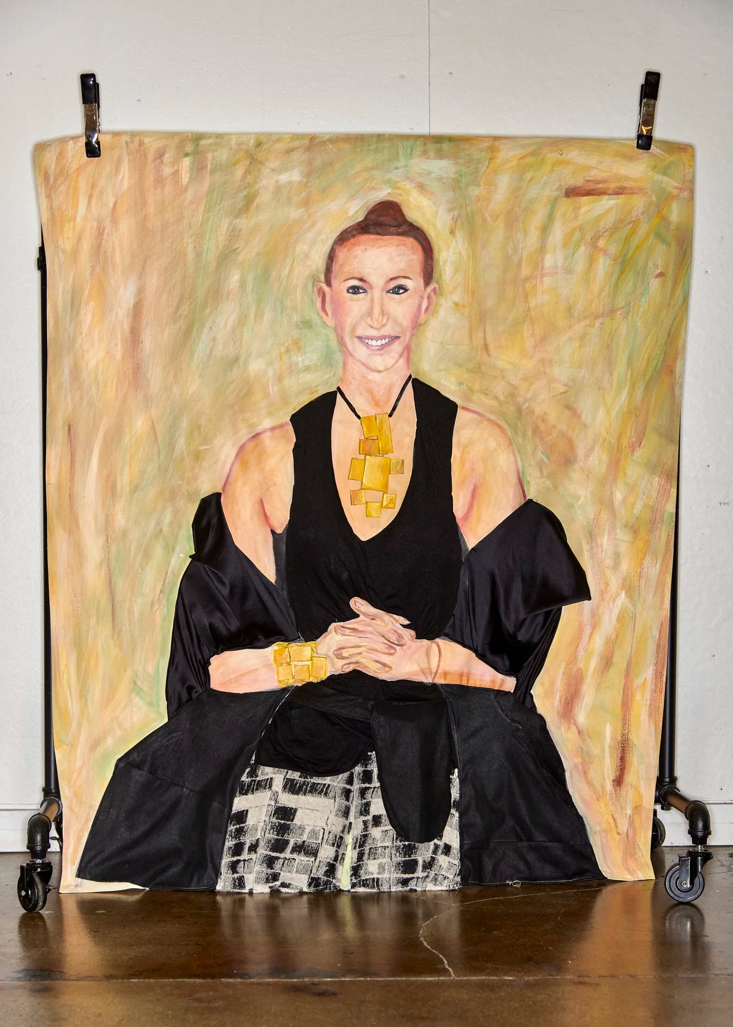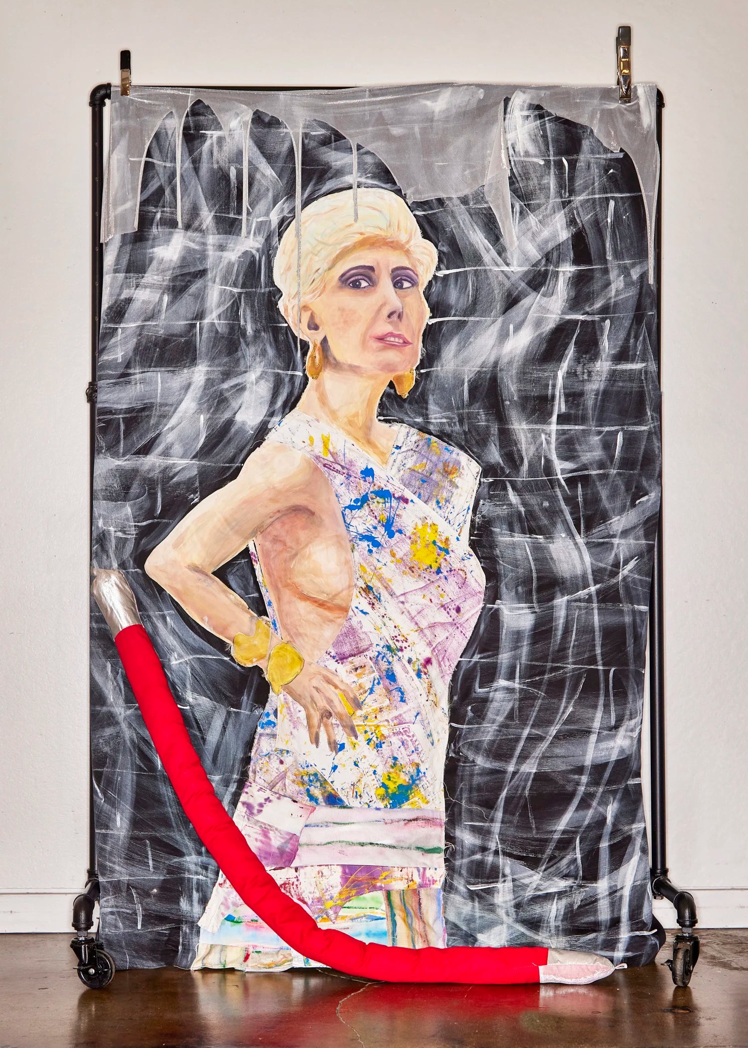 Mixed media portraits suspended from garment racks, featuring reconstructed looks from the Lauren Altman Studio collection.