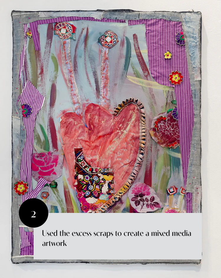 Leftover fabrics are repurposed into collectible artwork, accessories, and future designs—reappearing even as fashion show backdrops—ensuring nothing goes to waste and everything is given new life.