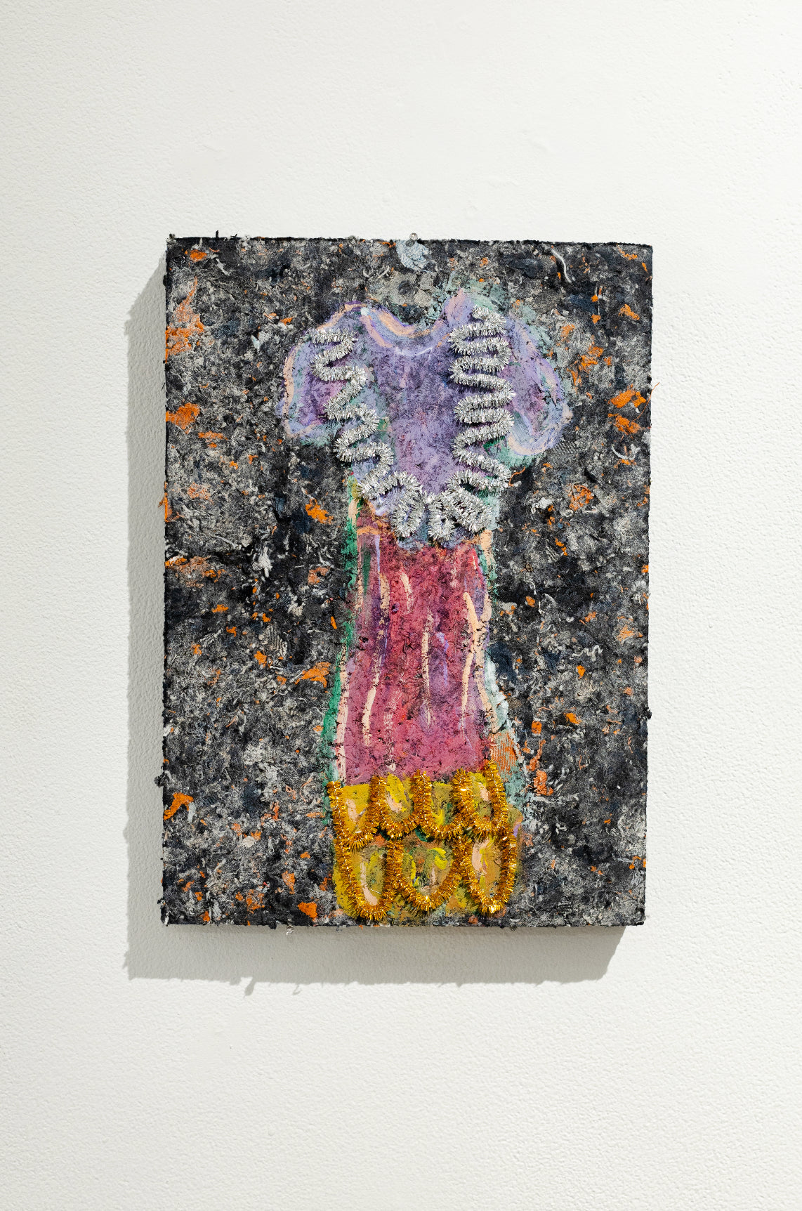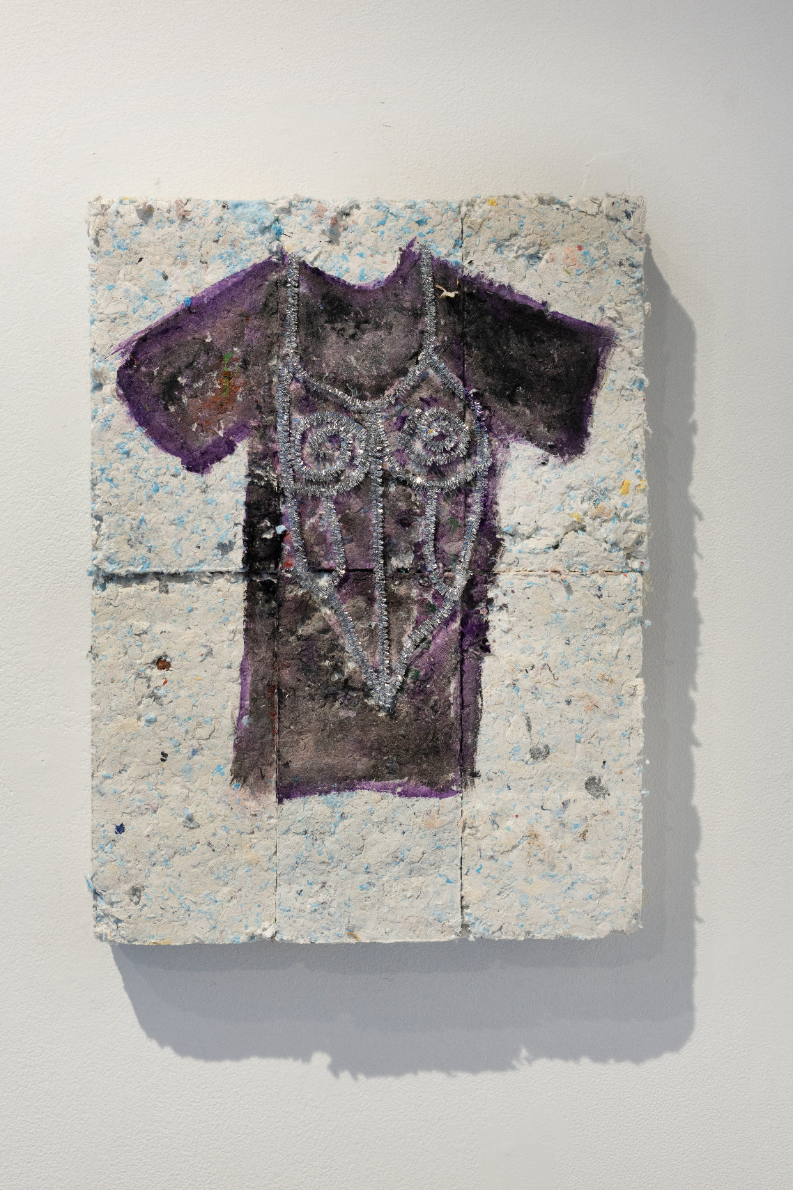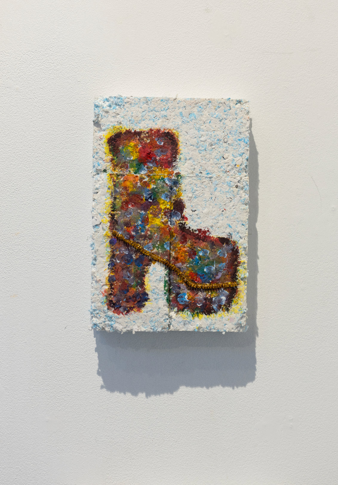Each brick features a garment or accessory from the runway collection, reimagined as a collectible artwork. Made from discarded fabric, the bricks are transformed into sculptural paintings that carry the spirit of the show into the gallery space.