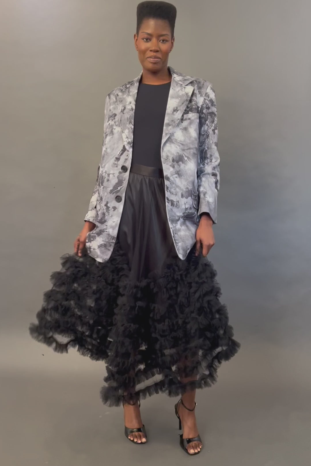 The Gesture Jacket reimagines the classic blazer as a longer, sculptural outer layer. Designed with structured shoulders, a notched lapel, and an intentionally oversized silhouette, it brings expressive ease to polished tailoring. Crafted in Lauren Altman’s signature brushstroke print, it carries the collection’s language of movement and painterly texture. Fully lined for transitional wear, it slips seamlessly from day to evening.